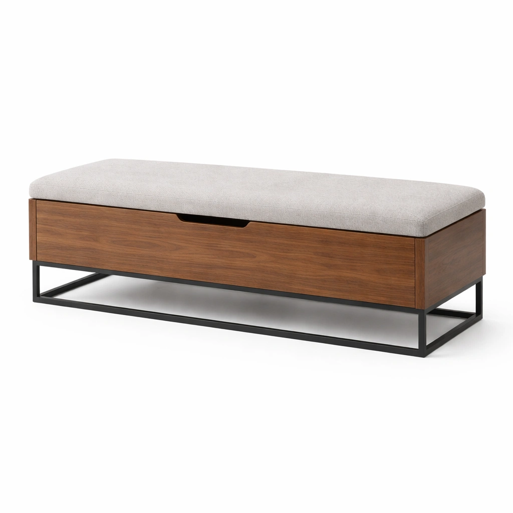 Banco con almacenamiento de madera y metal con asiento tapizado