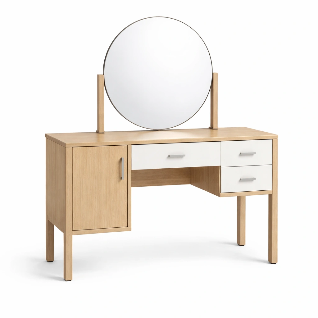 Tocador de madera con espejo redondo y cajones blancos