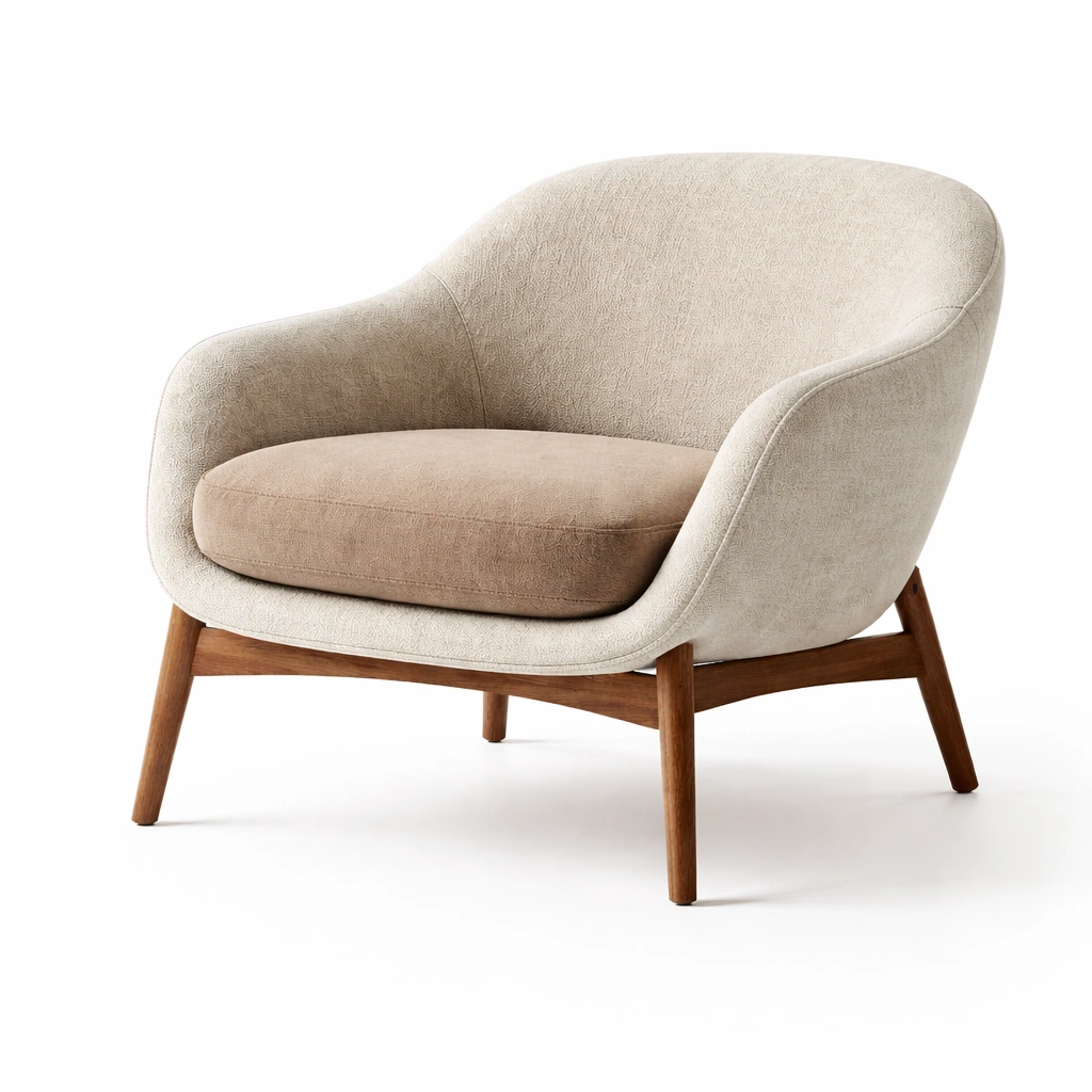 Estructura de madera maciza con acabado en barniz transparente. Tapicería de poliéster en beige y marrón. Cojín relleno de espuma de alta densidad. Dimensiones: 75 cm largo, 80 cm ancho, 78 cm altura. Peso: 10 kg. Uso en interiores. Respaldo ergonómico. Limpiar con paño húmedo, evitar exposición al sol.